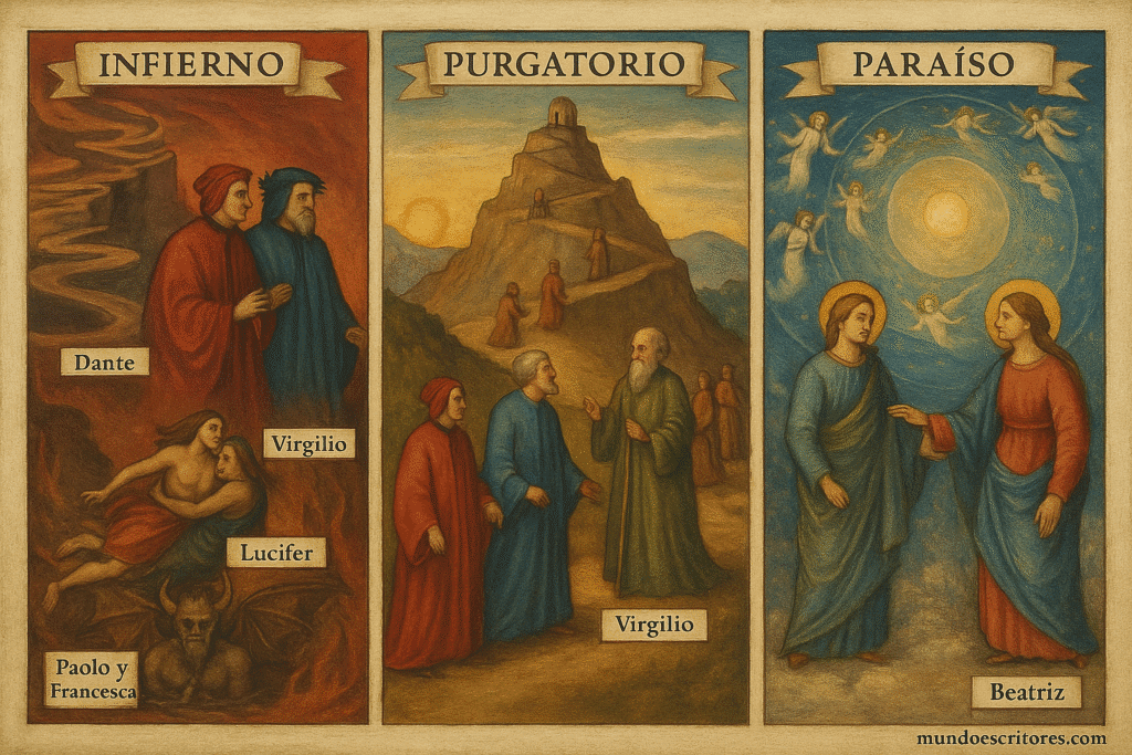 - Guías: Virgilio (razón poética y política) conduce por Infierno y Purgatorio; Beatriz (inteligencia amorosa) guía el Paraíso.